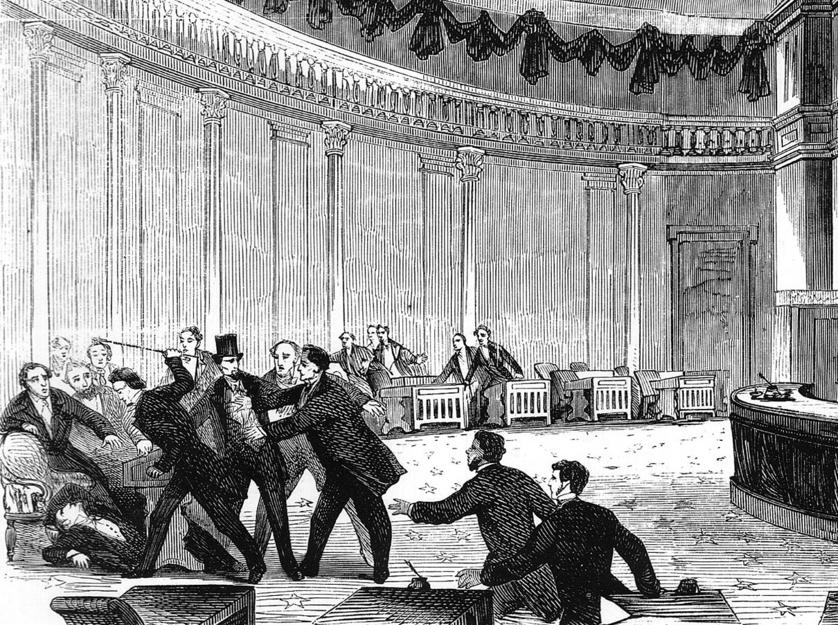 The Kansas-Nebraska Act repealed the Missouri Compromise, which had set boundaries for the expansion of slavery and maintained a tenuous balance between free and slave states. By opening new territories to "popular sovereignty," Congress effectively told the nation that the question of slavery (a question many believed was settled) was now back on the table. Violence soon followed. In what became known as "Bleeding Kansas," armed bands attacked towns, burned homes, and murdered political opponents. The brutality extended to the halls of Congress itself, where in 1856 Representative Preston Brooks of South Carolina savagely beat Senator Charles Sumner of Massachusetts with a cane on the Senate floor after Sumner delivered an anti-slavery speech. The violence was not simply the product of local rivalries; it was a preview of the Civil War that would erupt five years later.